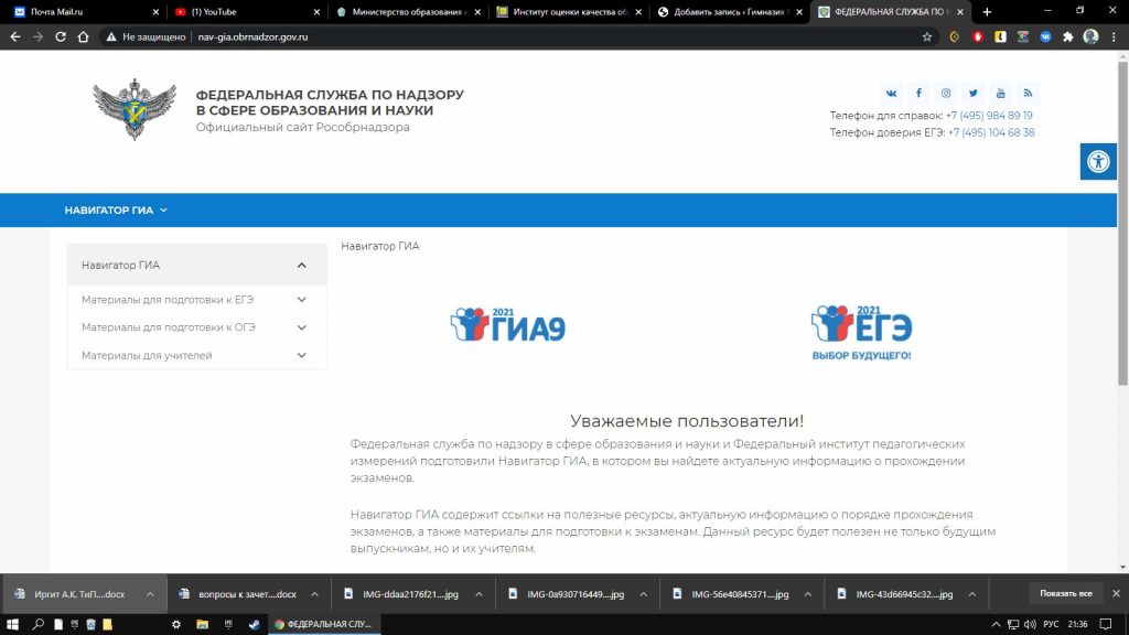 Федеральная служба по надзору в сфере образования и науки и Федеральный институт педагогических измерений (ФИПИ) запустили навигатор по материалам, которые будут полезны выпускникам и педагогам при подготовке к единому государственному экзамену (ЕГЭ) и основному государственному экзамену (ОГЭ) в 2021 году. «Навигатор ГИА» размещен в специальном разделе на сайте Рособрнадзора.