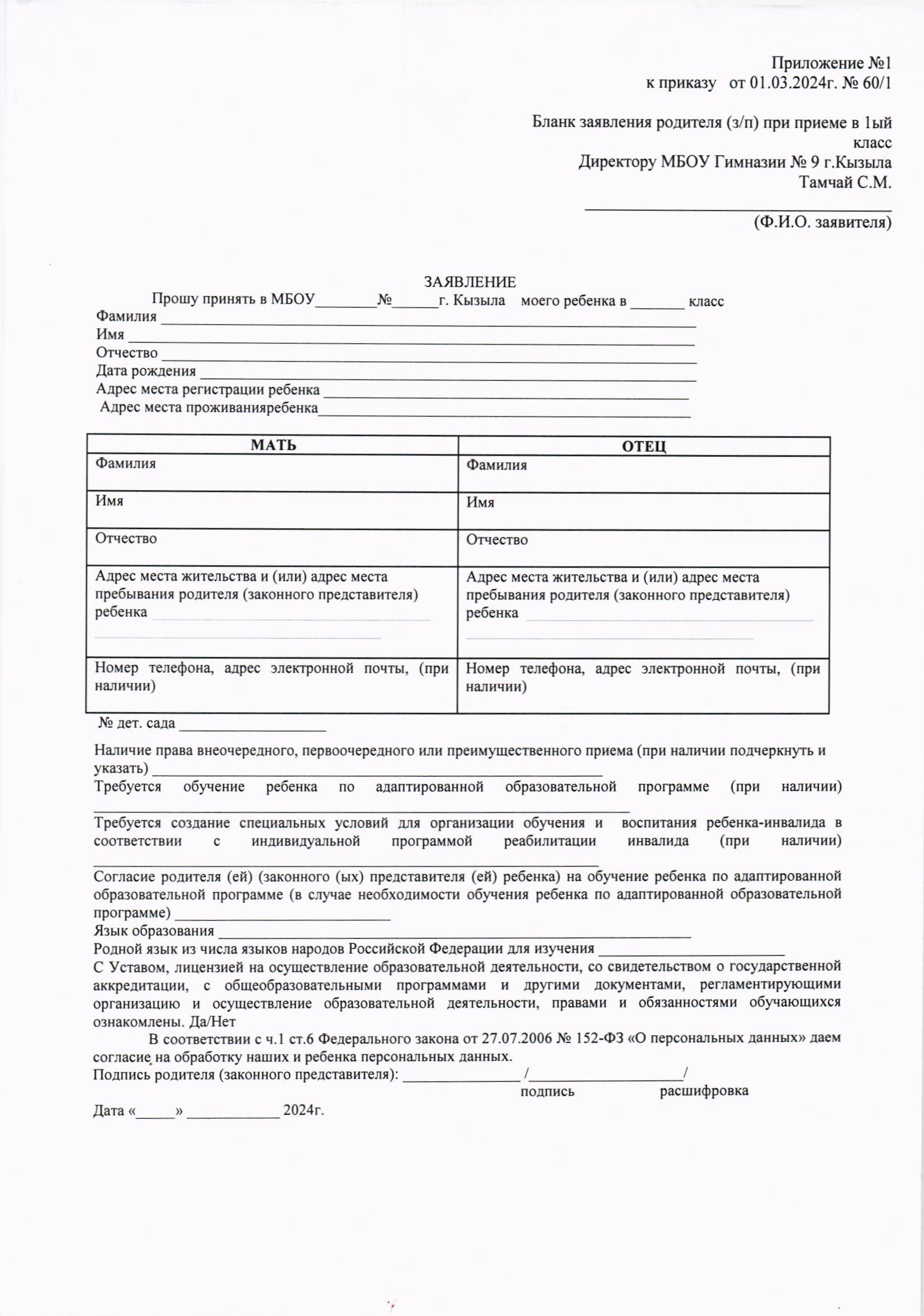 - Согласие родителя (ей) (законных представителей) ребенка на обработку персональных данных.